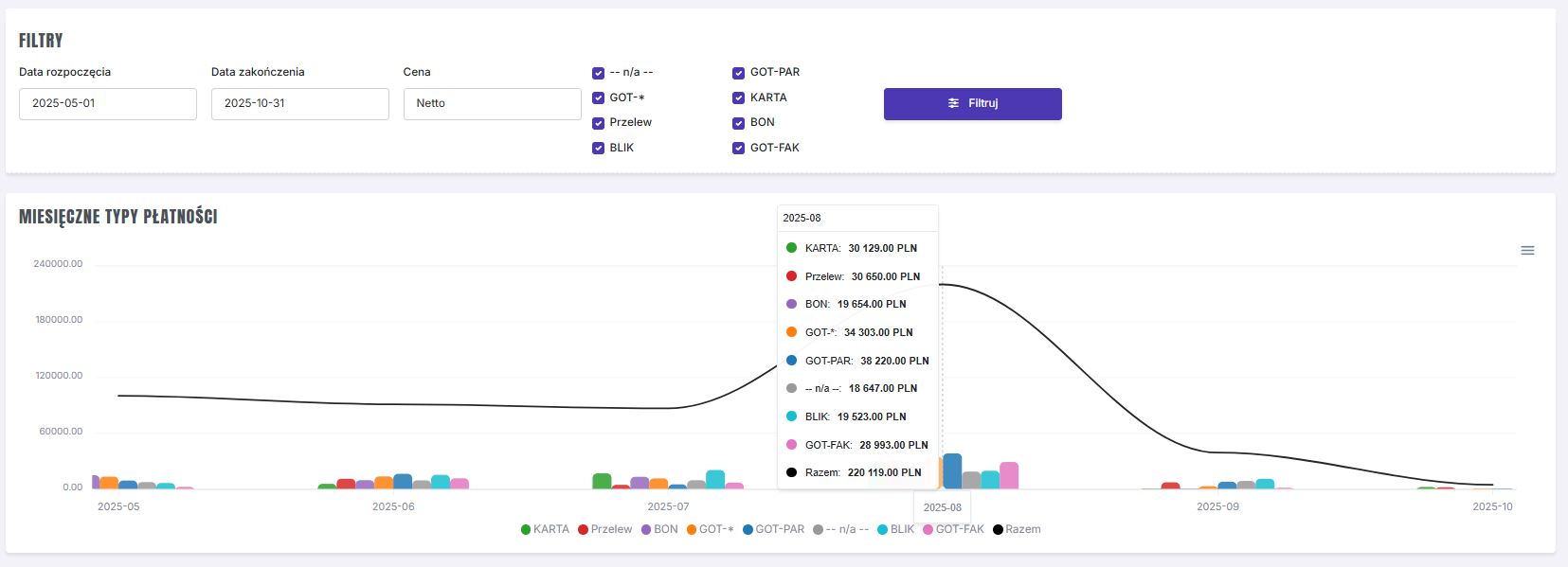 System automatycznie pobiera dane z innych modułów CRM – takich jak Zlecenia, Harmonogram czy Panel Wydatków – i przetwarza je w przejrzyste raporty i wykresy.