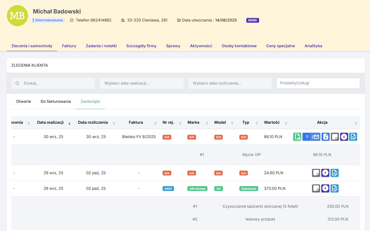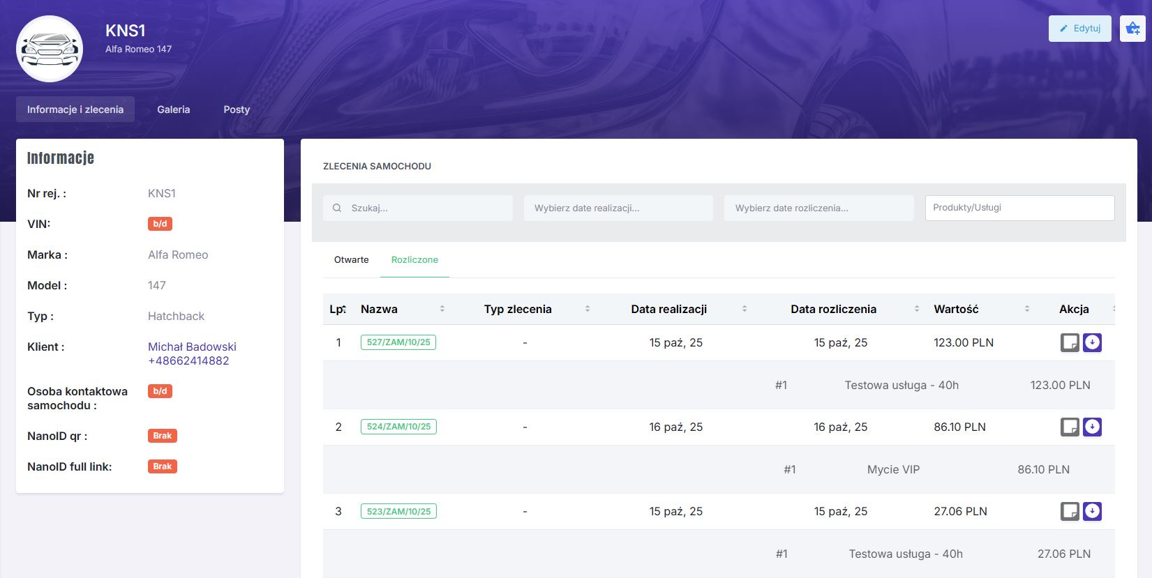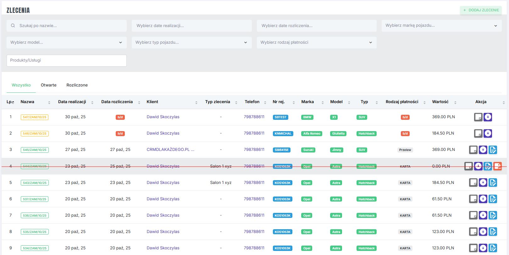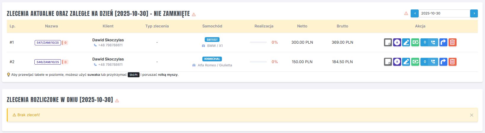 Zlecenie to kompletna „teczka” wizyty: klient, pojazd, usługi, notatki, płatności i harmonogram. Tworzysz je jednym kliknięciem — a system automatycznie obsługuje przypisanie pracownika i stanowiska, planowanie czasu, komunikację z klientem, rozliczenie i fakturę. Zlecenia pozwalają zapanować nad chaosem i skalować firmę bez utraty kontroli.